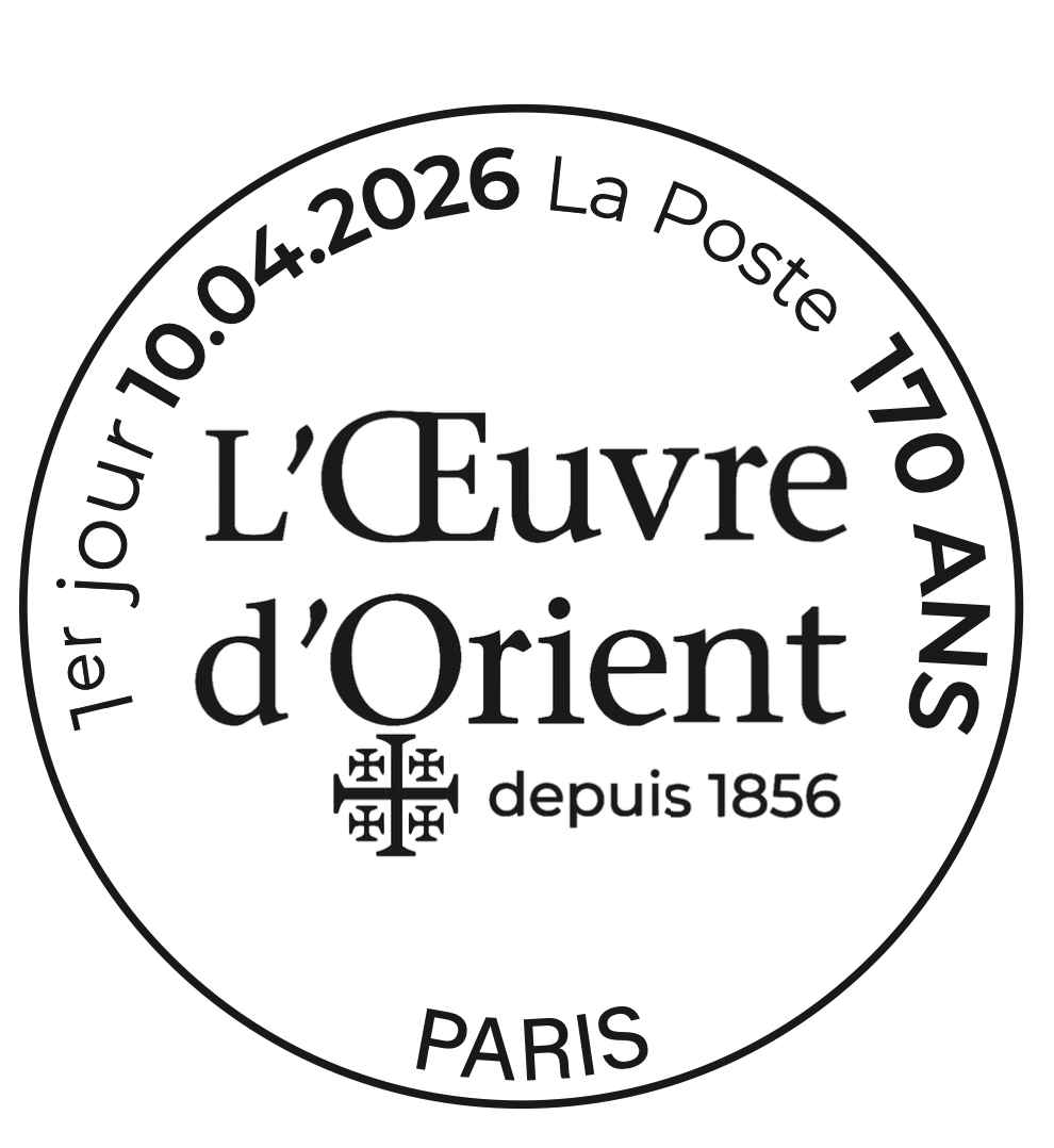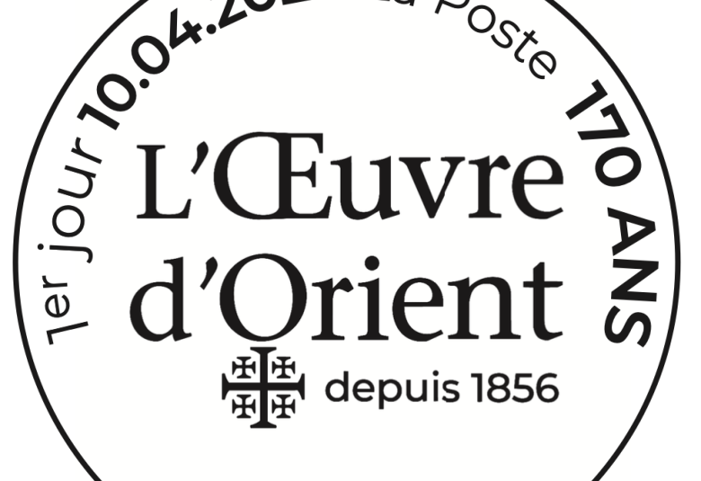 - Timbre à date mis en page par Sandrine Chimbaud d’après le logo des 170 ans de l’Œuvre d’Orient.