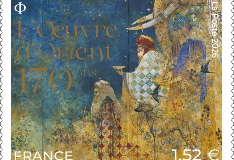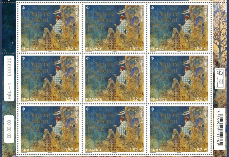 La Poste célèbre les 170 ans d’engagement solidaire de l’Œuvre d’Orient. Le timbre reprend La célébration de l’Épiphanie ou l’Adoration des rois mages, un tableau d’Augustin Frison-Roche (350 x 460 cm) exposé au Collège des Bernardins à Paris. Le choix de l’Épiphanie s’inscrit dans la tradition des Églises orientales où cette fête est souvent célébrée en lien étroit avec Noël. Une dorure sublime le titre de timbre ainsi que celui de la feuille.