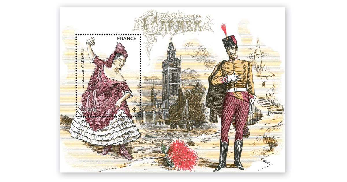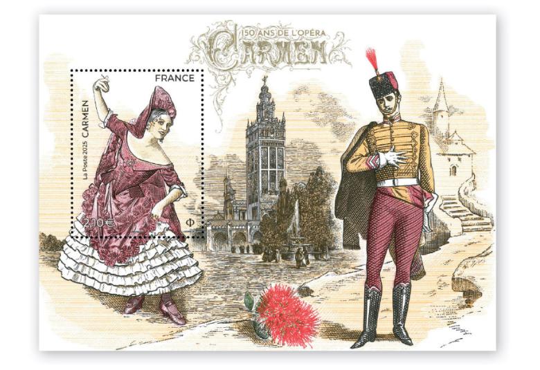 Un bloc-feuillet d’un timbre. Création et gravure : Sarah Lazarevic d’après photos Ebon Theodora Vilhelmina Strandin dans le rôle de Carmen, 1922 © akg-images (timbre) et Don José, officier de dragons, dessin de Percy Anderson © British Library / Aurimages – Cover of the score of the « Carmen » by Giorgio Bizet © Heritage images / Aurimages –