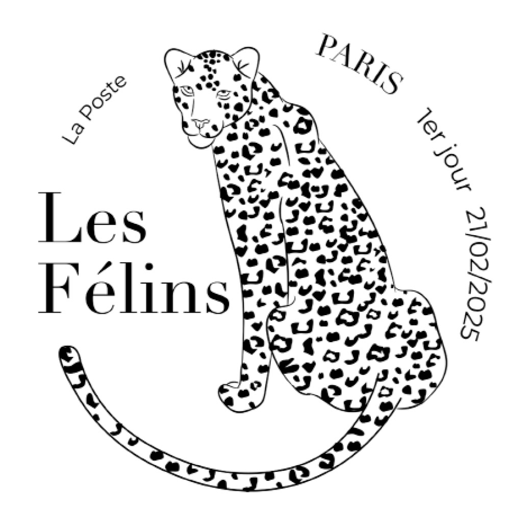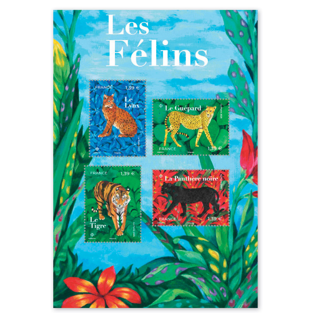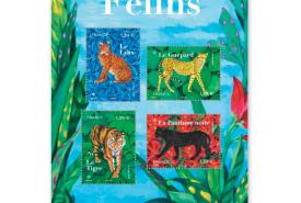 24 février 2025 Les félins : un bloc-feuillet de quatre timbres-poste Création : Vincente Exbrayat. Impression : héliogravure. Valeur faciale : 1,39 €.