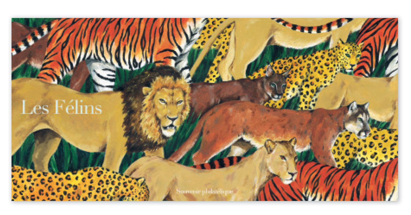 Les félins : un souvenir philatélique composé d’une carte double volet et de deux feuillets gommés de deux timbres chacun.