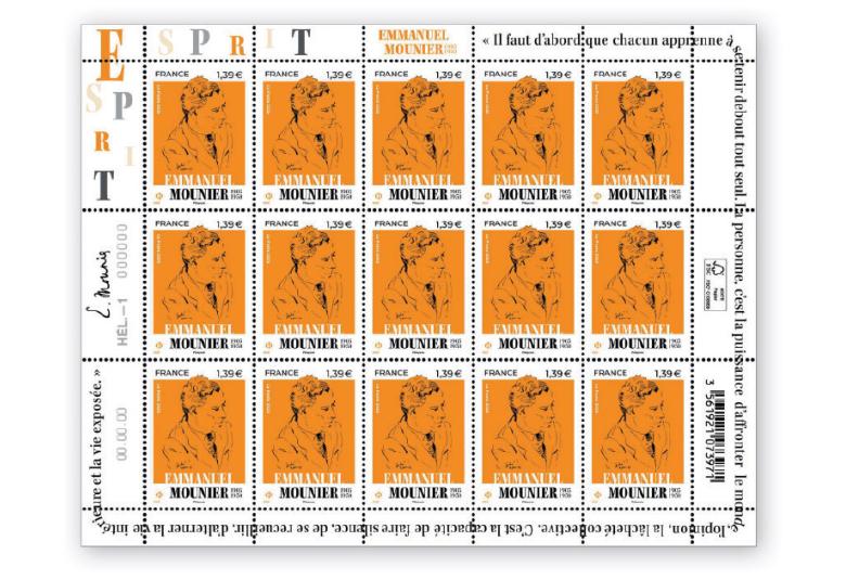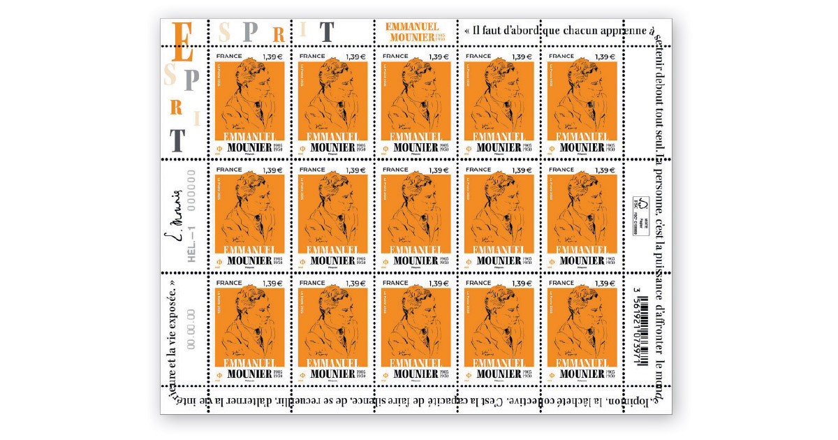Mise en page : Ségolène Carron. Timbre : œuvre de René Iché, Portrait d’Emmanuel Mounier, 18 janvier 1947, © Adagp, Paris, 2024, d’après photo fonds AAEM.