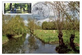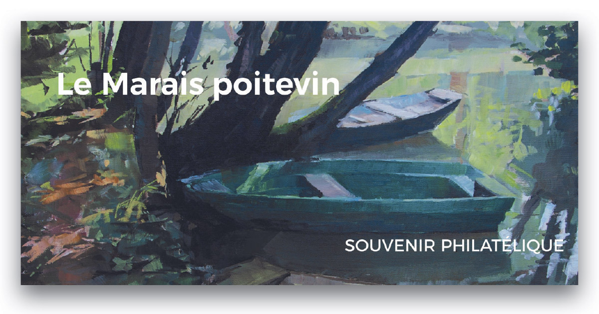 Le Marais poitevin : un souvenir philatélique composé d’une carte double volet et d’un feuillet gommé d’un timbre. Création : Raphaële Goineau.