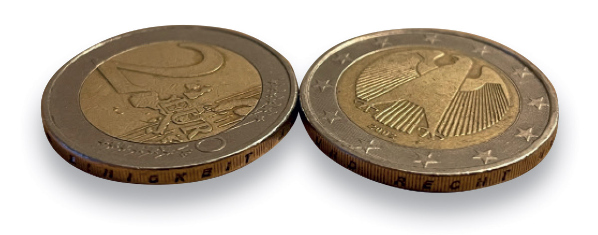 Concernant les monnaies en euros, les tranches des monnaies de 2 euros peuvent changer en fonction du pays. Certains ont décidé d’adopter une tranche commune formée d’une répétition d’étoiles, mais d’autres comme l’Allemagne ont décidé de faire apparaître du texte. Si vous regardez dans votre porte-monnaie ou dans votre collection une pièce de 2 euros allemande qu’elle soit courante avec l’aigle, ou commémorative, vous verrez sur la tranche de celle-ci l’inscription : EINIGKEIT UND RECHT UND FREIHEIT qui signifie Unité, Droit, Liberté : la devise de la République Fédérale d’Allemagne. 5