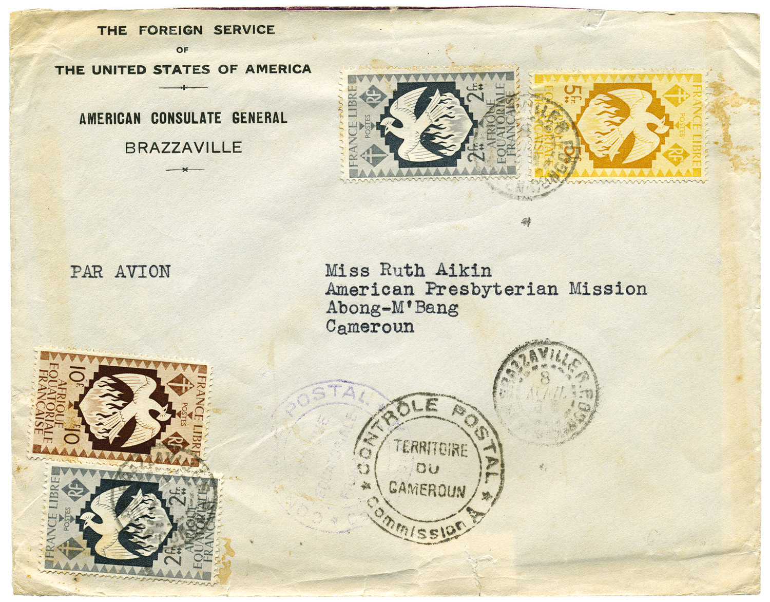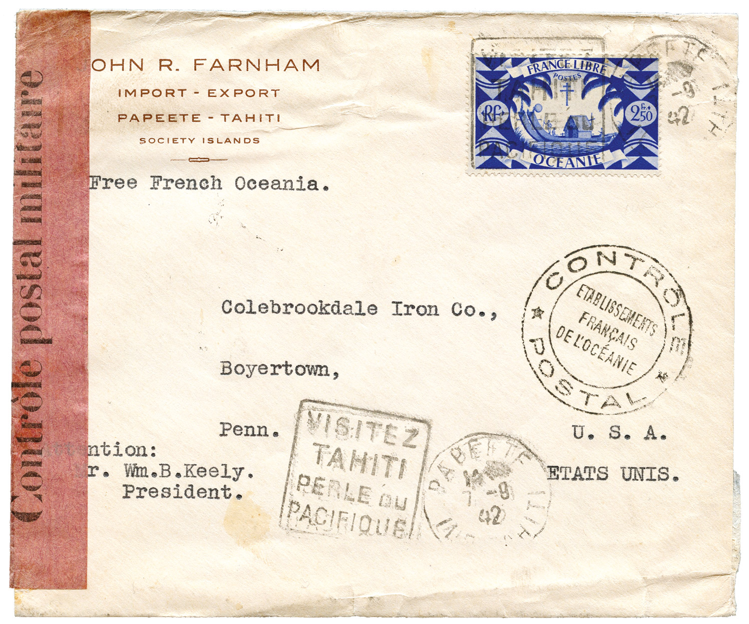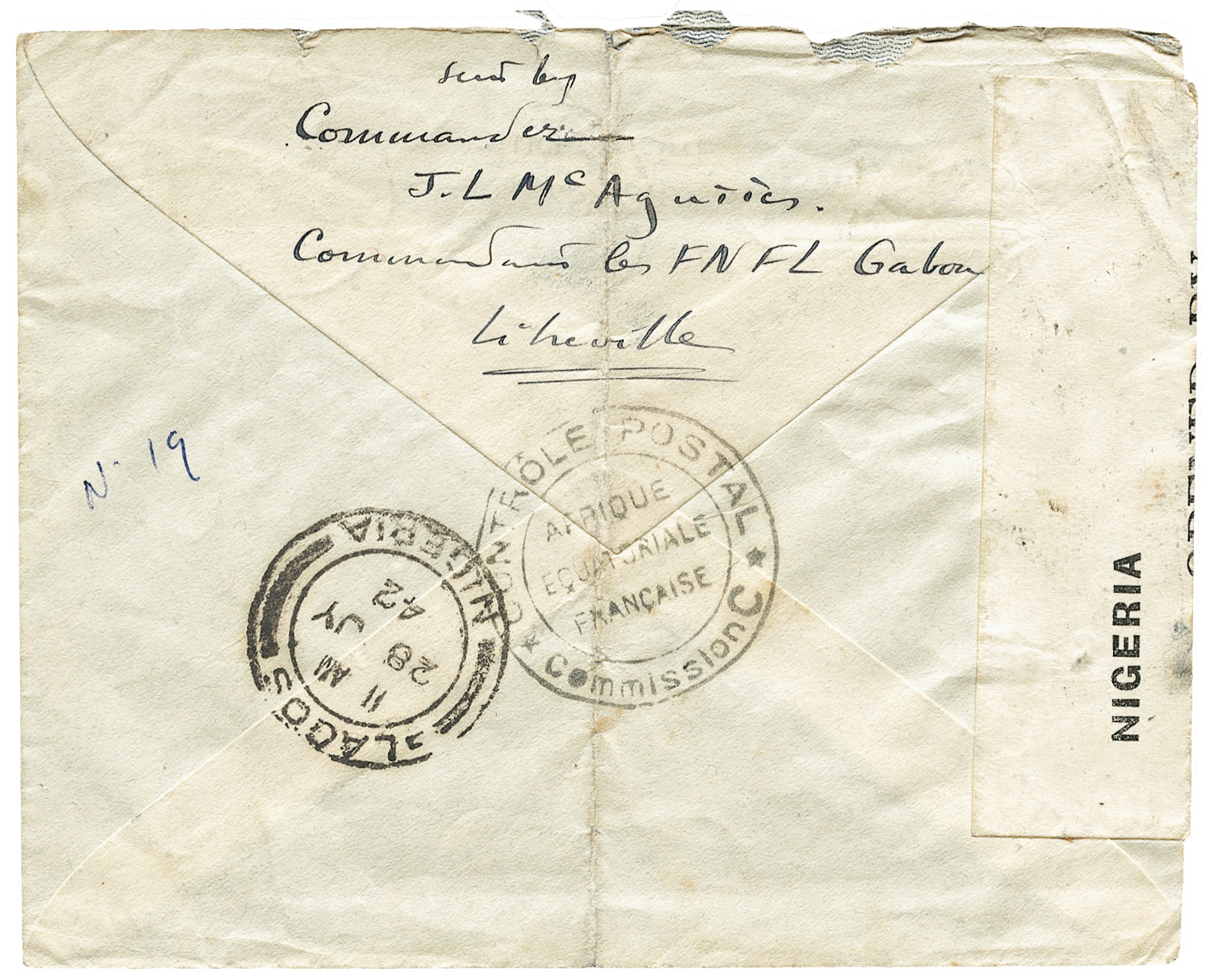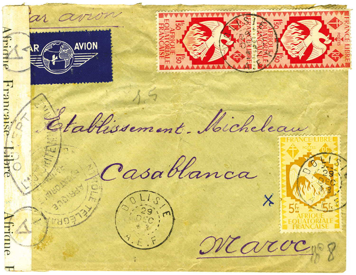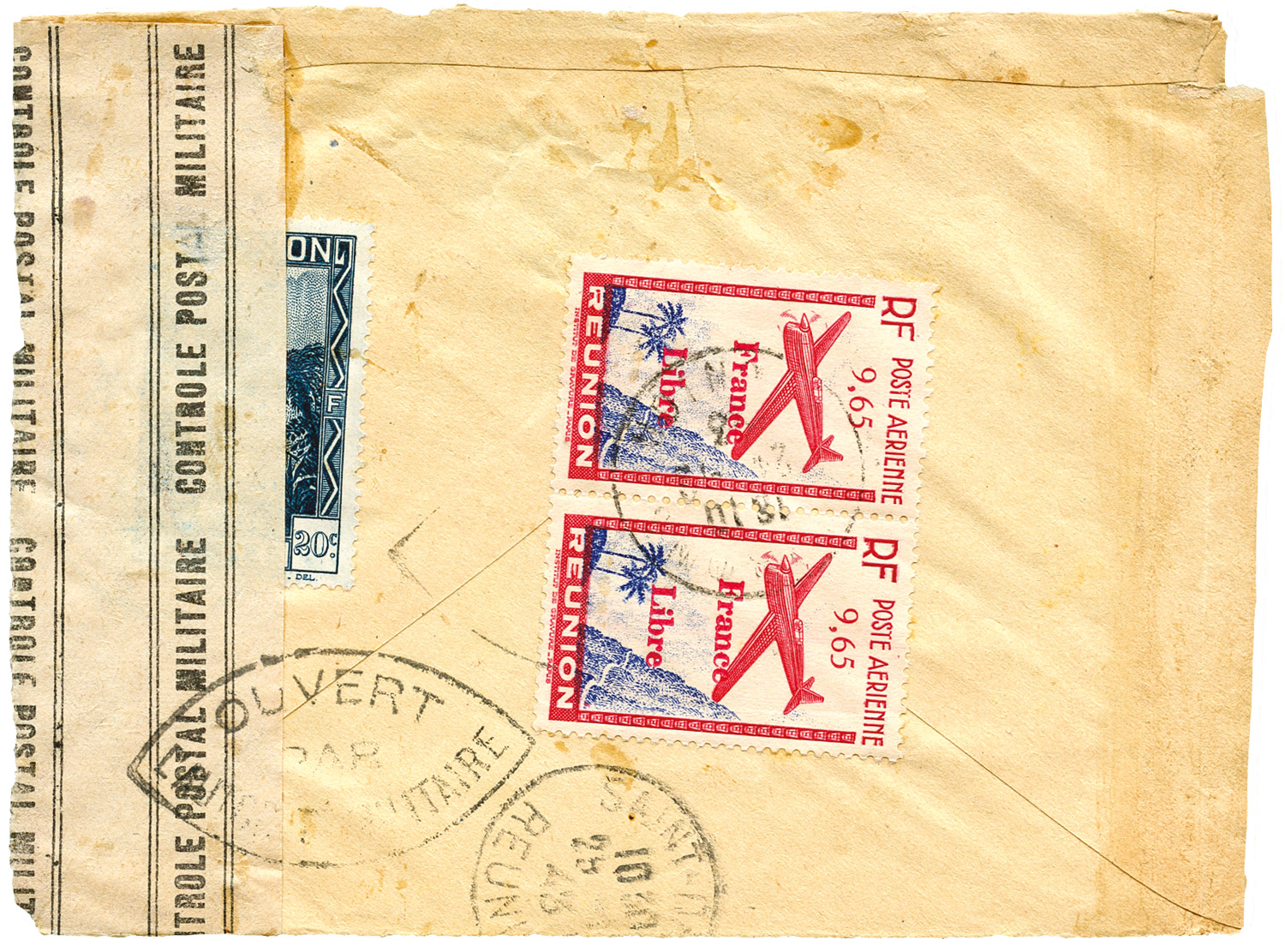 De l’été 1940 à juillet 1943, la France libre rallie 13 territoires de l’Empire colonial, en Afrique, dans le Pacifique, puis en Amérique du nord, enfin dans l’Océan indien. Le contrôle postal militaire exerce une surveillance sur les correspondances. Une mission essentielle est d’éviter la sortie en fraude de capitaux, d’or, voire de timbres.