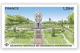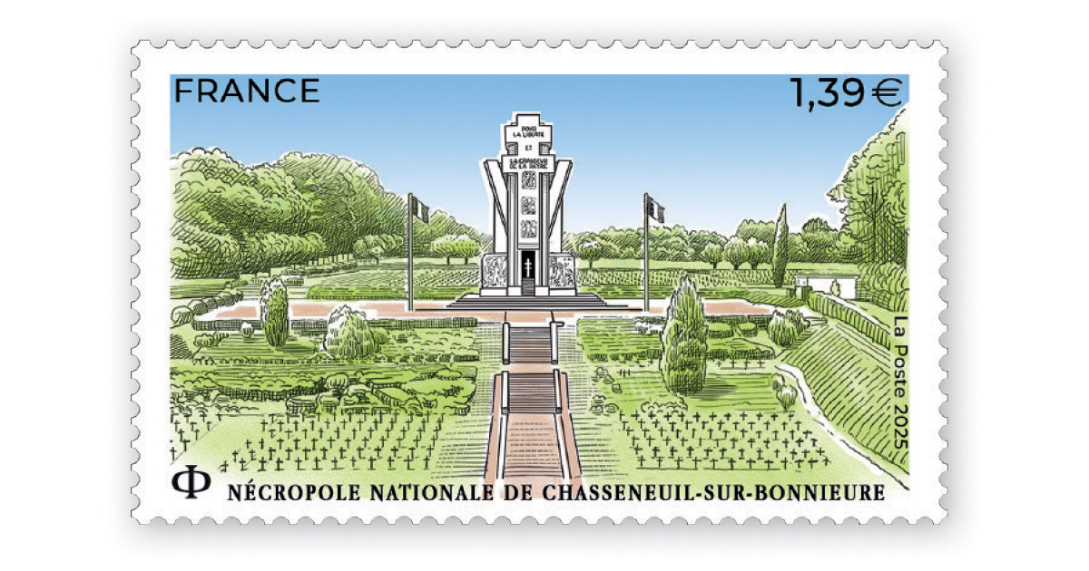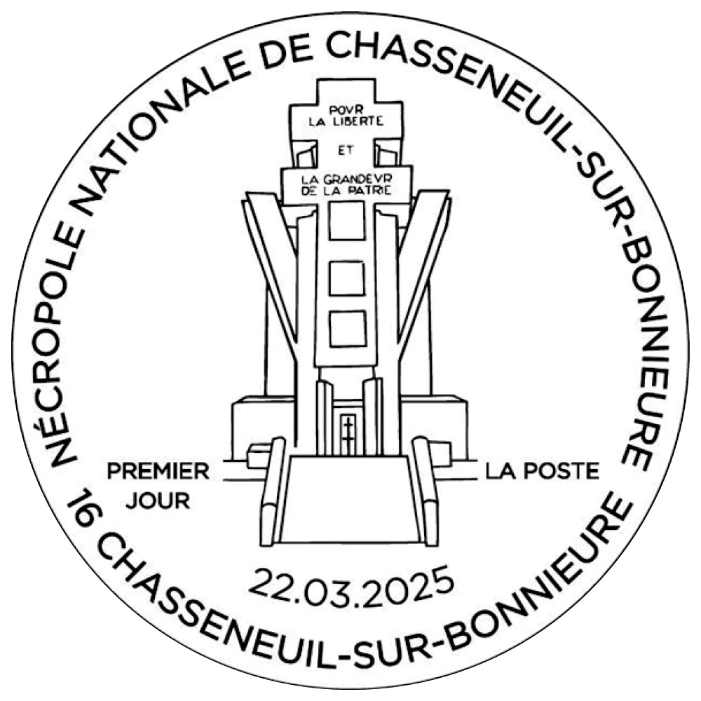 24 mars 2025 Nécropole nationale de Chasseneuil-sur-Bonnieure : un timbre-poste. Création et gravure : André Lavergne d’après photo © Stéphane Méril, © Fernand Poncelet architecte. Impression : taille-douce. Valeur faciale : 1,39 €. Usage postal : lettre verte jusqu’à 20g. Format du timbre : 52 x 31 mm. Présentation : 12 timbres à la feuille. Tirage : 604 800 exemplaires.