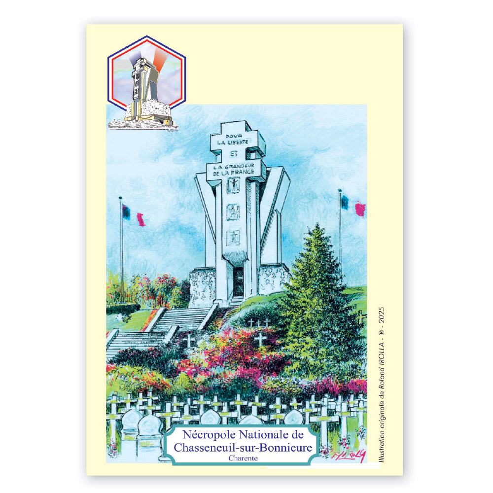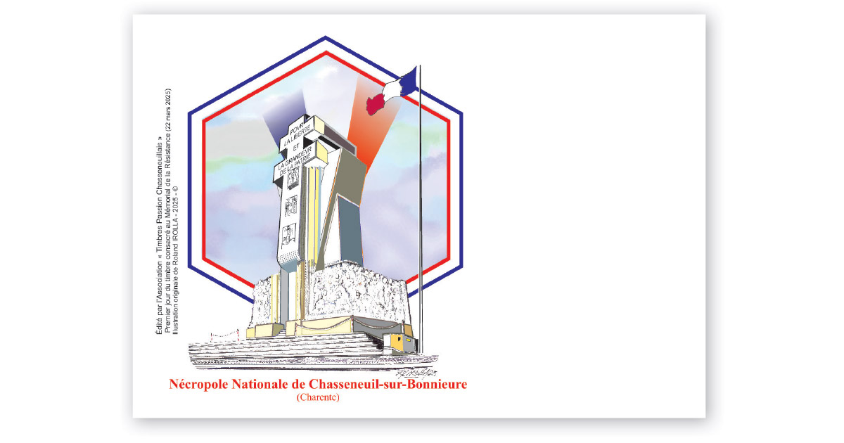 A l’occasion de l’émission du timbre dédié à la Nécropole nationale de Chasseneuil-sur-Bonnieure, l’association Timbres Passion Chasseneuillais proposera trois souvenirs « premier jour » dessinés par Roland Irolla : une carte postale, une enveloppe et un encart en 120 exemplaires.