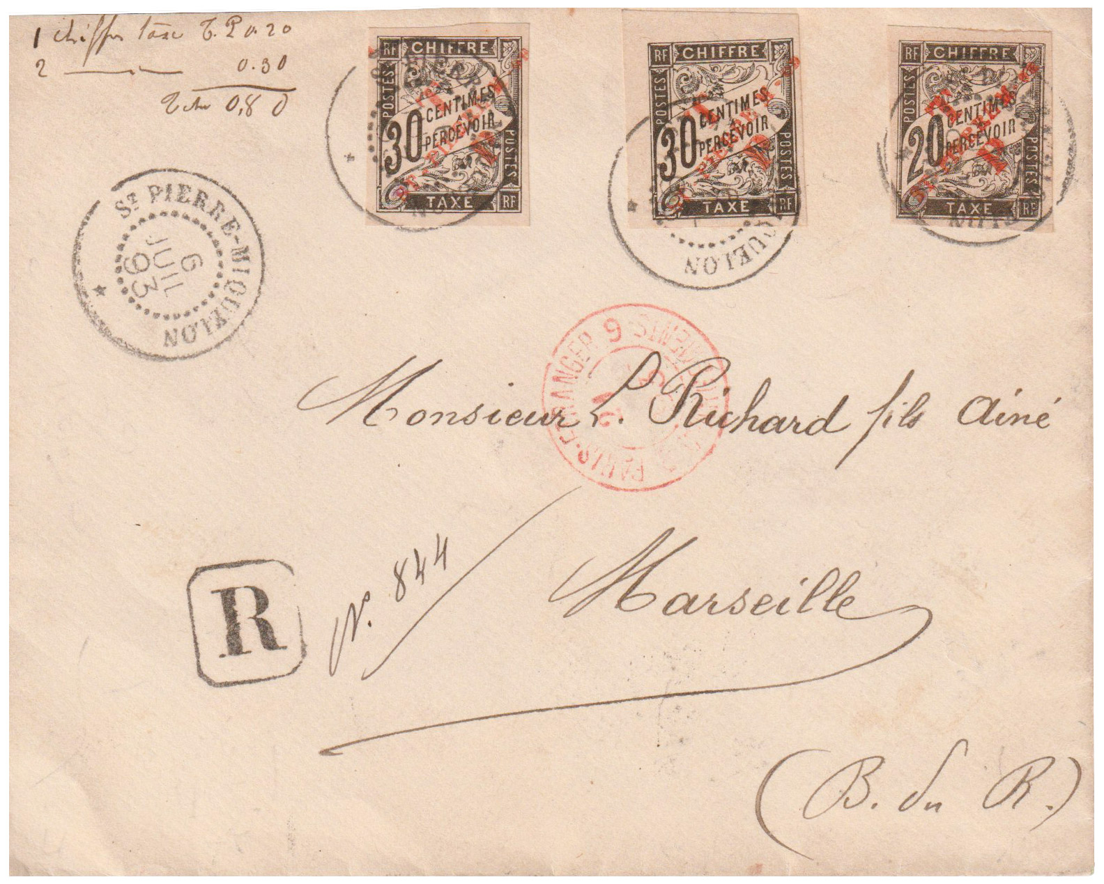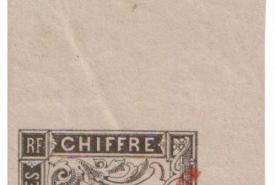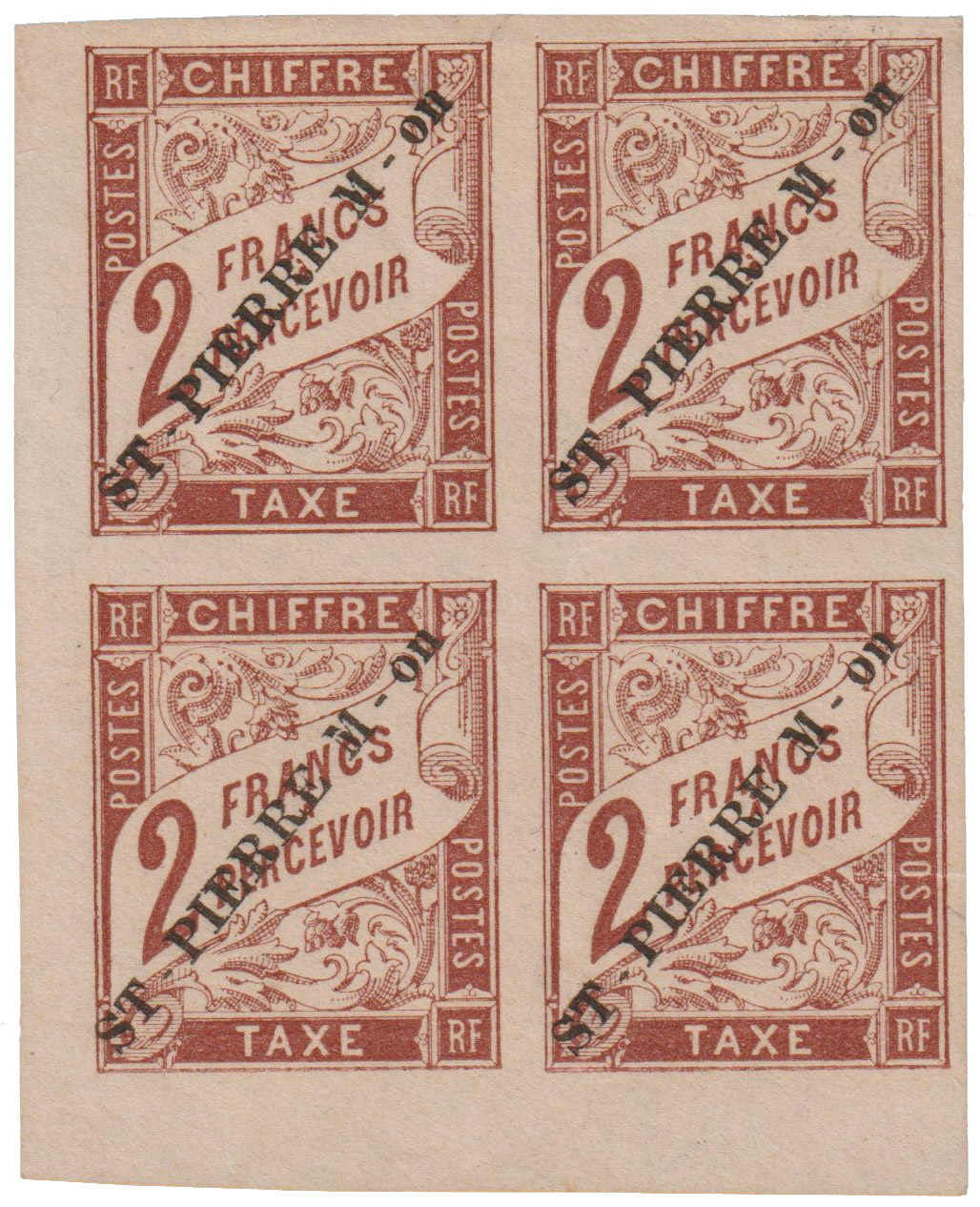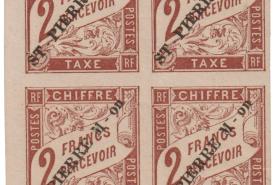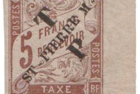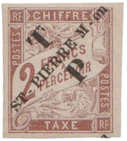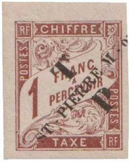 Plus de sept années se sont écoulées, et fin 1892, les timbres-taxe ont eux aussi été revêtus d’une frappe typographique « ST-PIERRE M-on » apposée diagonalement en rouge ou en noir sur neuf valeurs : les 5c, 10c, 15, 20c, 30, 40c, 60c, 1f et 2f. (1bis)