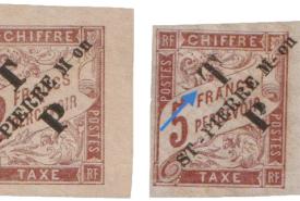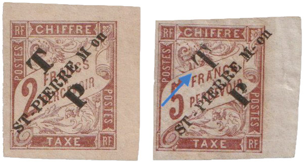 Sur cette composition, on retrouve les mêmes petites variétés de caractères visibles sur la première impression de ces timbres-taxe. Une page d’exposition regroupe ces différentes variétés ainsi que des frappes partielles légères et un exemple inhabituel de frappes décalées (4). Ces variétés, bien connues des collectionneurs spécialisés dans les « classiques », sont listées dans le catalogue « TILLARD » depuis 2017. Le type 2 L’an passé, soit 132 ans après leurs émissions, j’ai découvert une particularité qui avait échappé aux collectionneurs de Saint-Pierre-et-Miquelon.