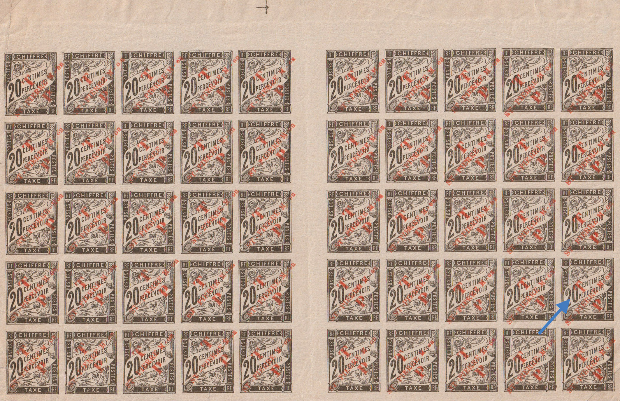 Les 10c, 20c, 30c, 40c et 60c sont frappées à l’encre rouge, et les 1f, 2f et 5f ont, quant à eux, une impression réalisée en noir (2). Le 5f n’avait pas été utilisé lors de l’impression des premiers timbres-taxe quelques jours plus tôt.