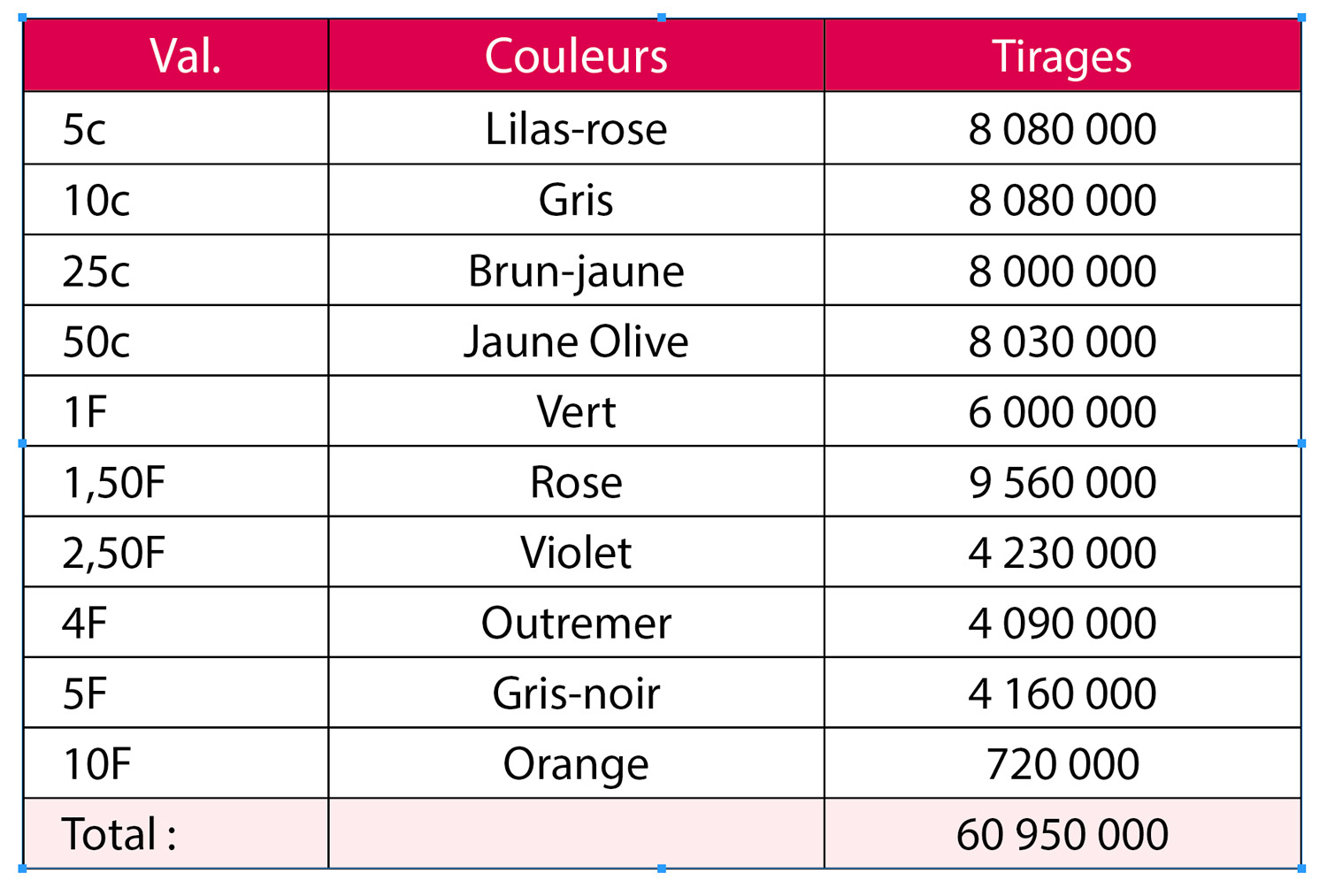 - 10 centimes : journaux, cécogrammes (massages en braille pour les aveugles).
