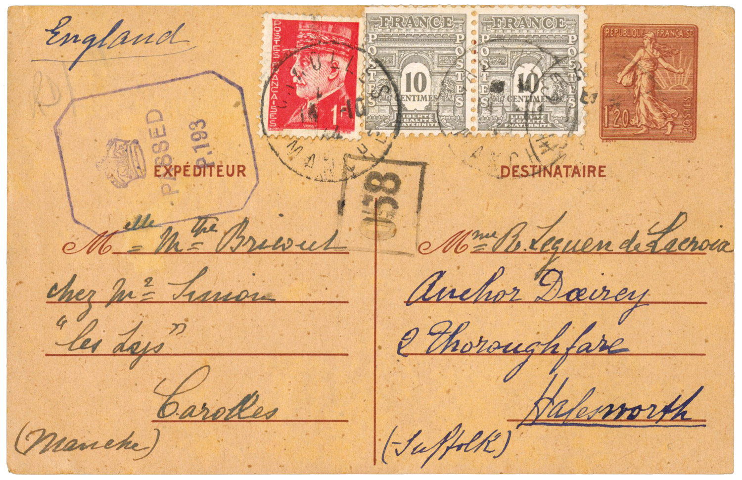 Il est vrai que les valeurs faciales des timbres Arc de Triomphe, qui ne tiennent guère compte des tarifs postaux du 5 janvier 1942 ne sont pas d'une grande aide.