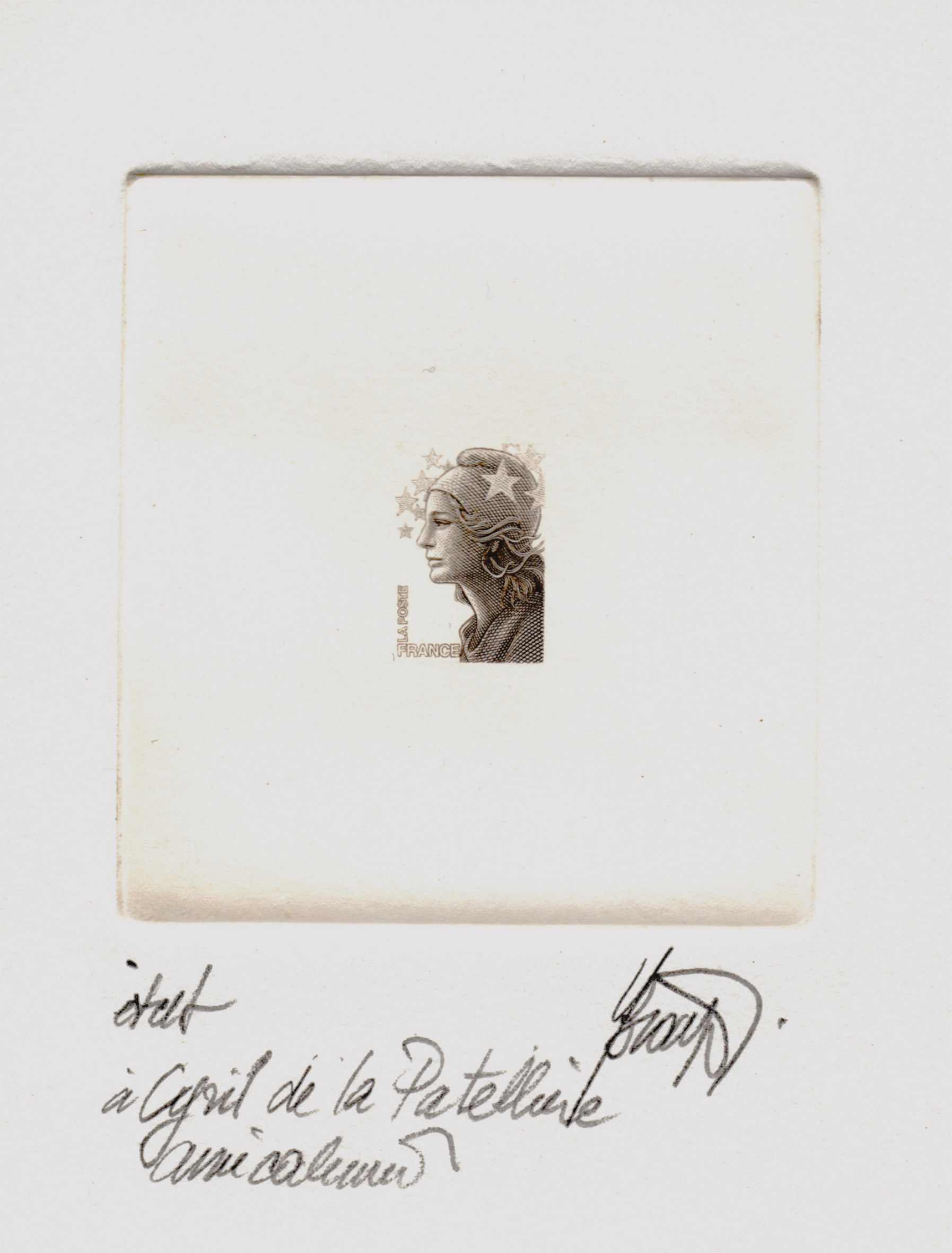 Collectionneur impénitent d’oeuvres d’art, philatéliques ou pas, je possède une certaine petite pièce unique que beaucoup de collectionneurs convoitent comme je m’en aperçois par rapport à toutes les demandes que j’ai pu avoir sur cet objet. Il ne s’agit, ni plus ni moins, que de l’épreuve d’état, dédicacée de surcroît par son auteur, de la Marianne dite de Beaujard.