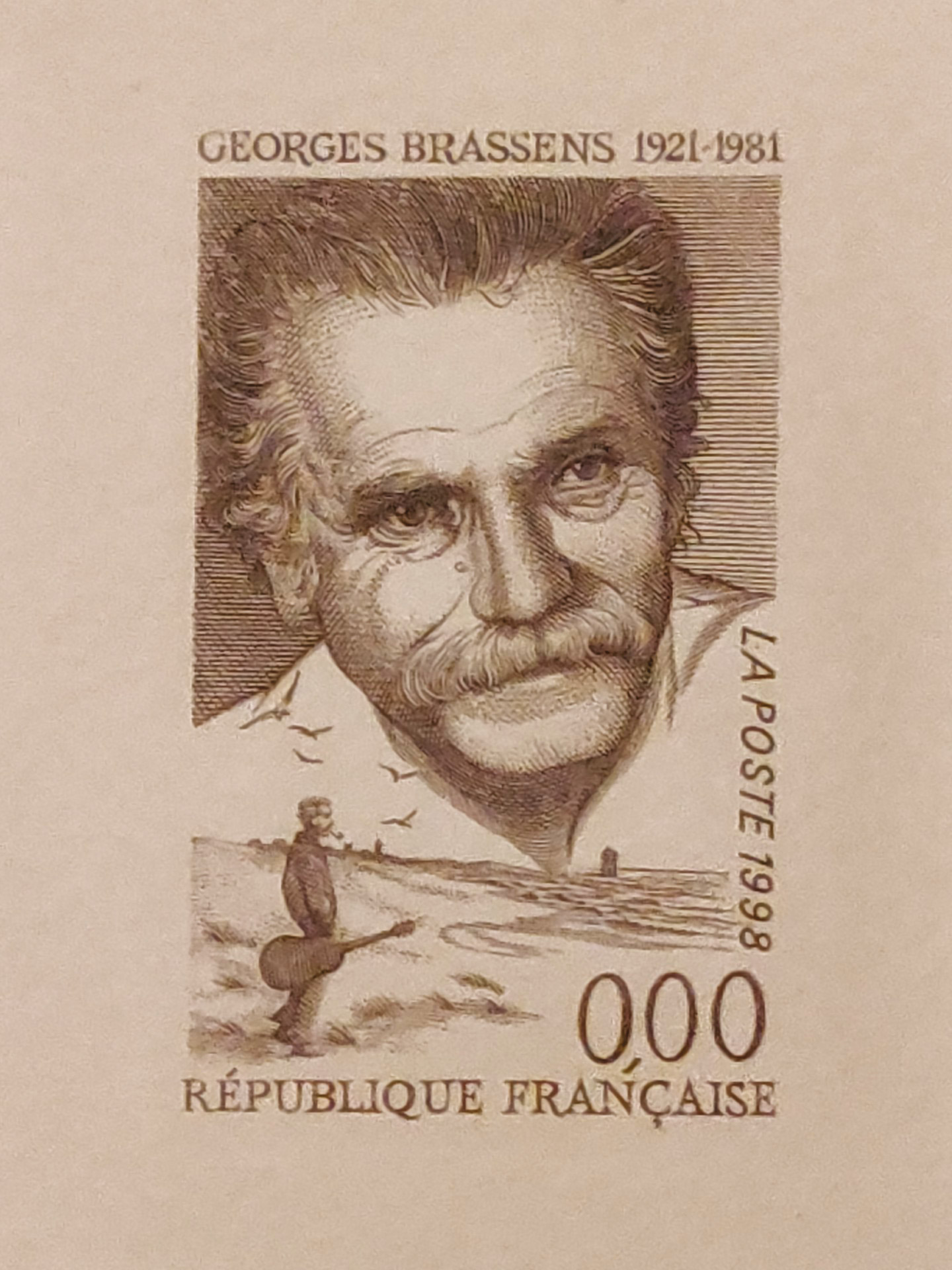 on ne peut les citer tous. Un nombre incalculable de dessins sont nés ainsi pendant vingt ans sous son crayon et son pinceau. Je note d’ailleurs que dans l’hommage appuyé qui lui a été rendu dans la revue de l’Art du Timbre Gravé « Del & Sculpt. » de décembre 2024, il est fait uniquement allusion au graveur mais c’est oublier cette vingtaine d’années (tout un bail) consacrée au dessin pur et à l’illustration de livres. Seulement, au bout de ce temps peut-on dire que le burin le démangeait ? Yves Beaujard retourna donc vers la Poste et le SNTP de ce temps (Service National des Timbres-Poste) pour finalement accepter un essai. Il choisit de graver un portrait de Georges Brassens.